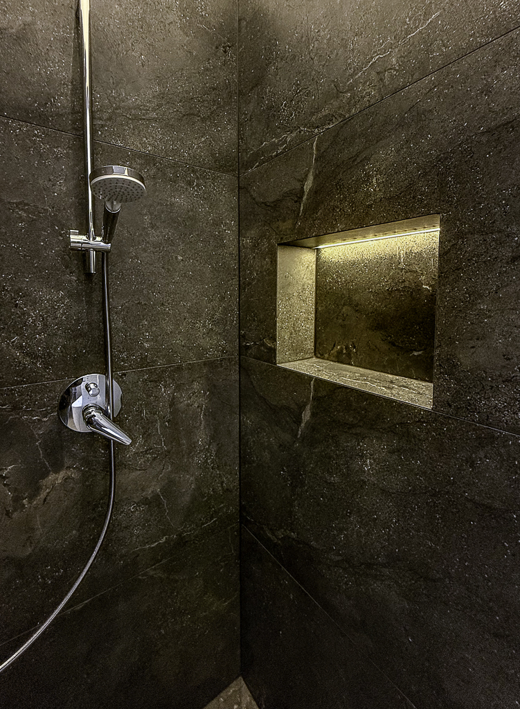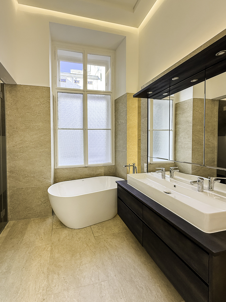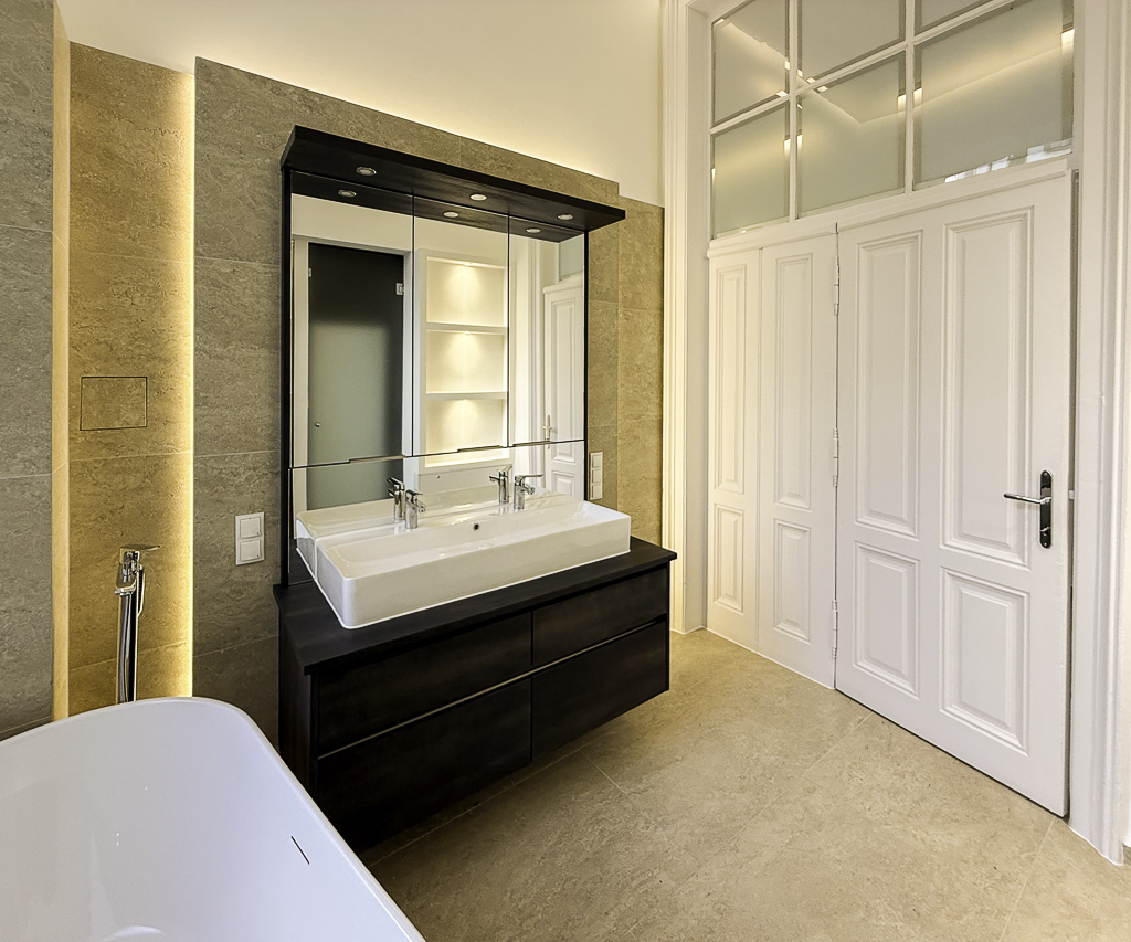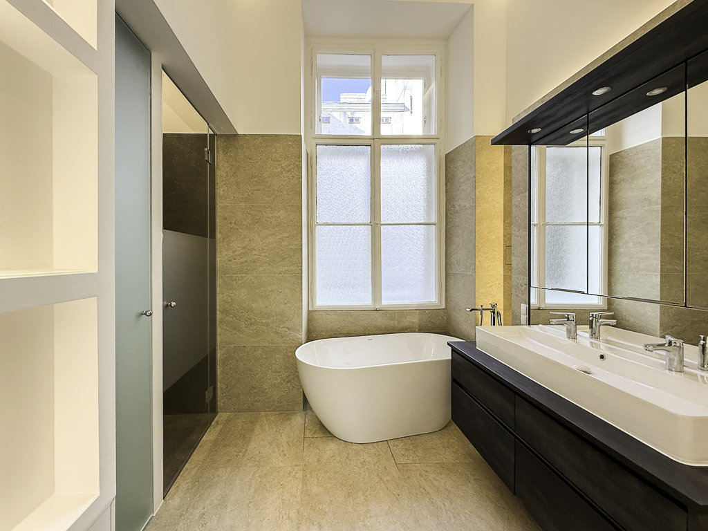 - geschmackvolles Wellness-Bad mit Doppelwaschtisch, Dusche und freistehender Badewanne